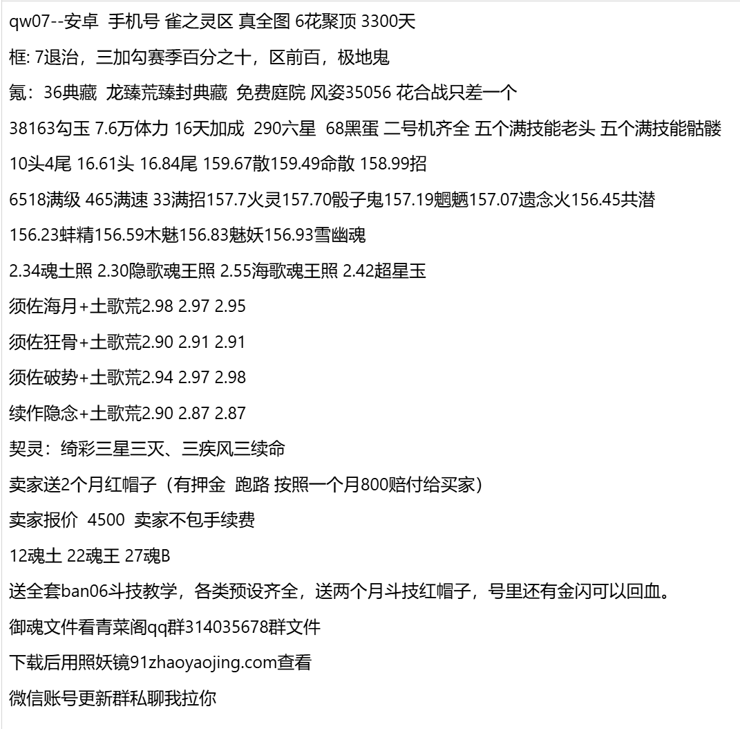 qw07--安卓 手机号 雀之灵区 真全图 6花聚顶 3300天