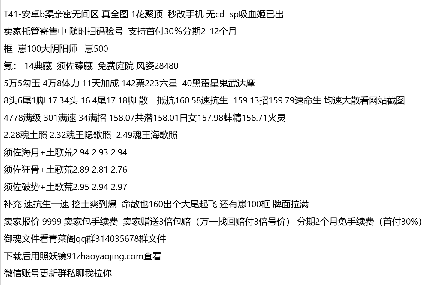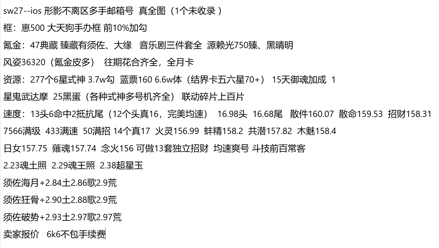资源:277个6星式神 3.7w勾 蓝票160 6.6w体(结界卡五六星70+) 15天御魂加成 1