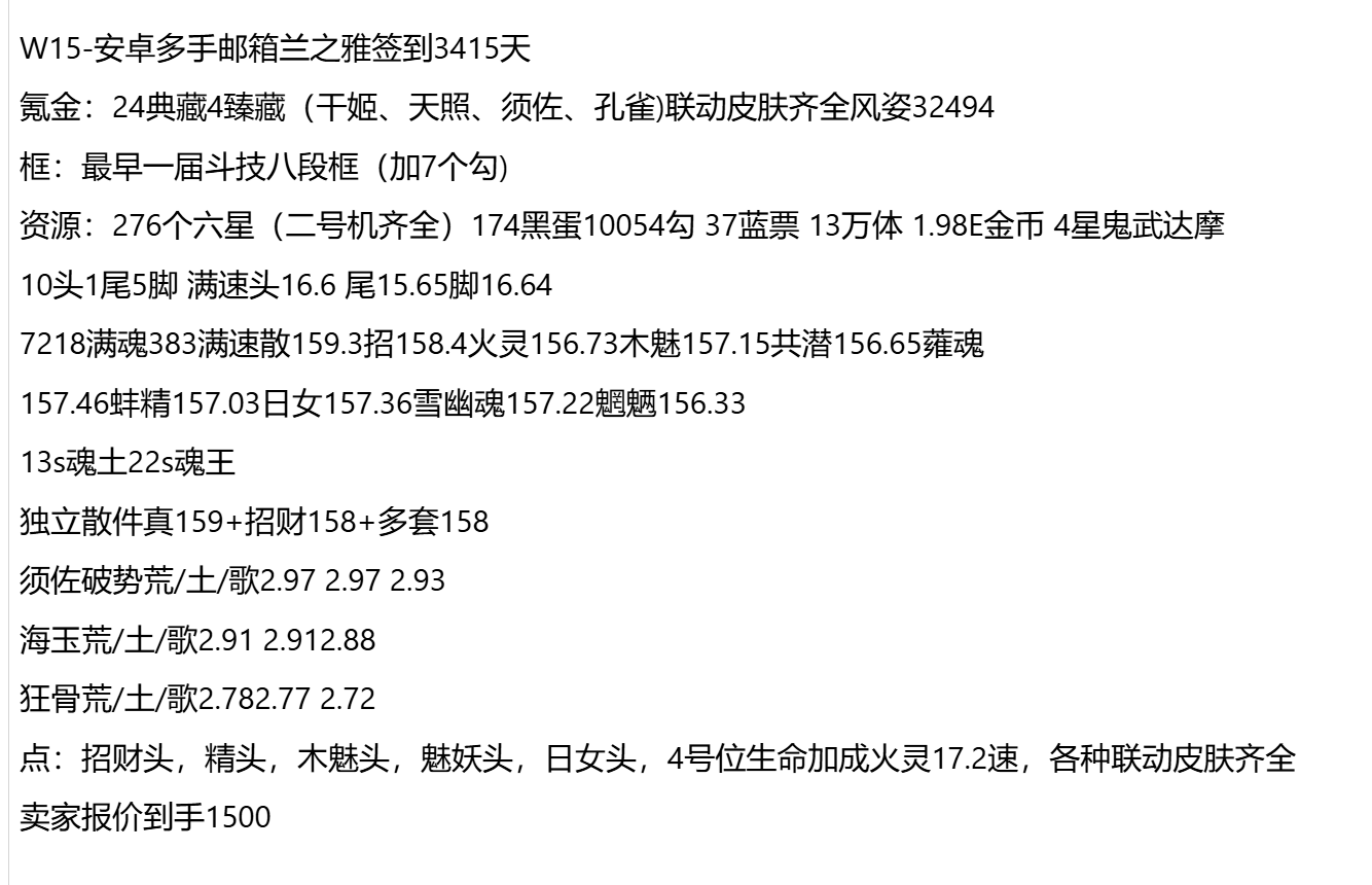 点:招财头,精头,木魅头,魅妖头,日女头,4号位生命加成火灵17.2速,各种联动皮肤齐全