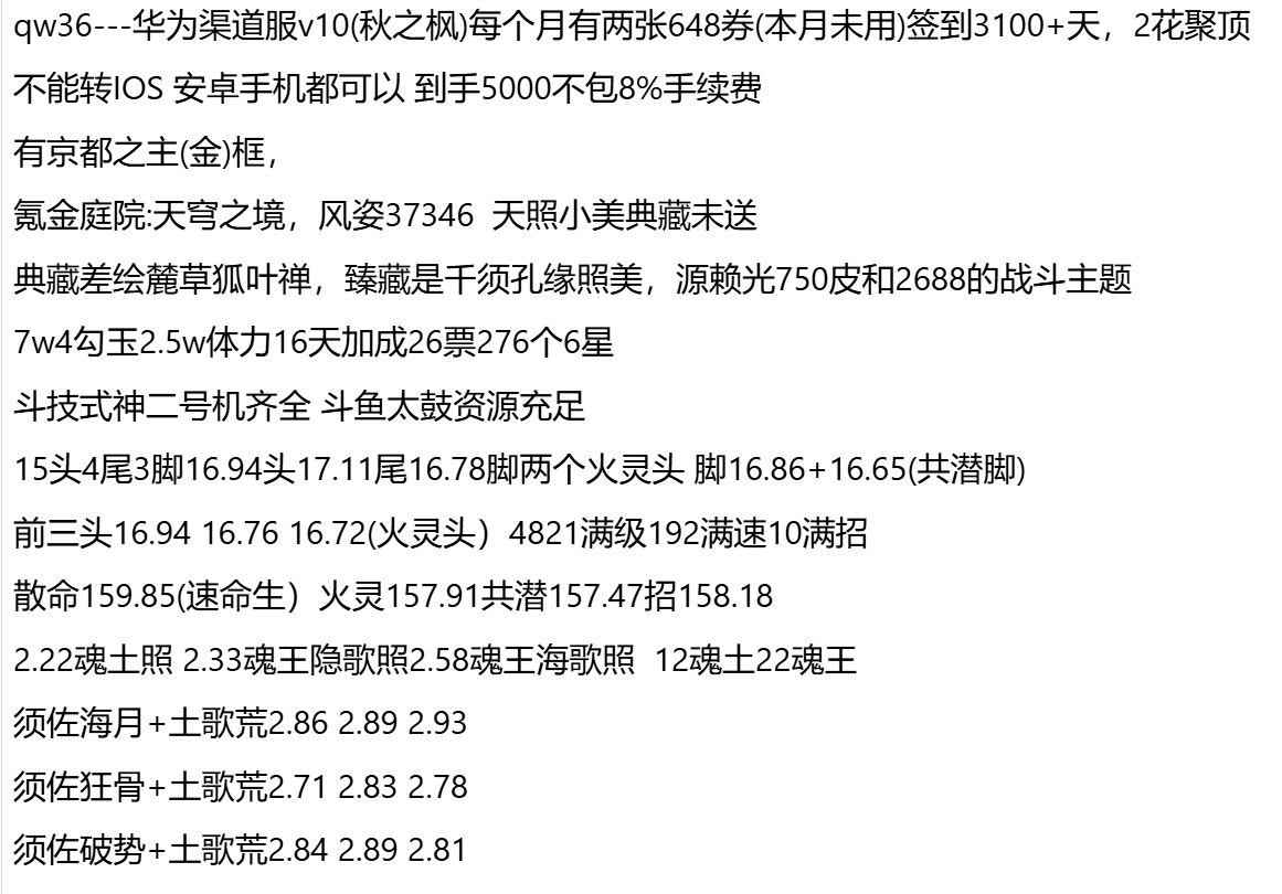 qw36---华为渠道服v10(秋之枫)每个月有两张648券(本月未用)签到3100+天,2花聚顶