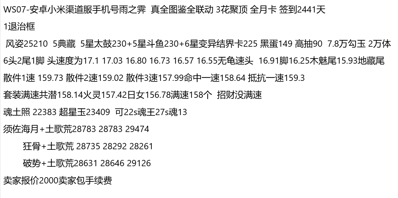 WS07-安卓小米渠道服手机号雨之霁 真全图鉴全联动 3花聚顶 全月卡 签到2441天