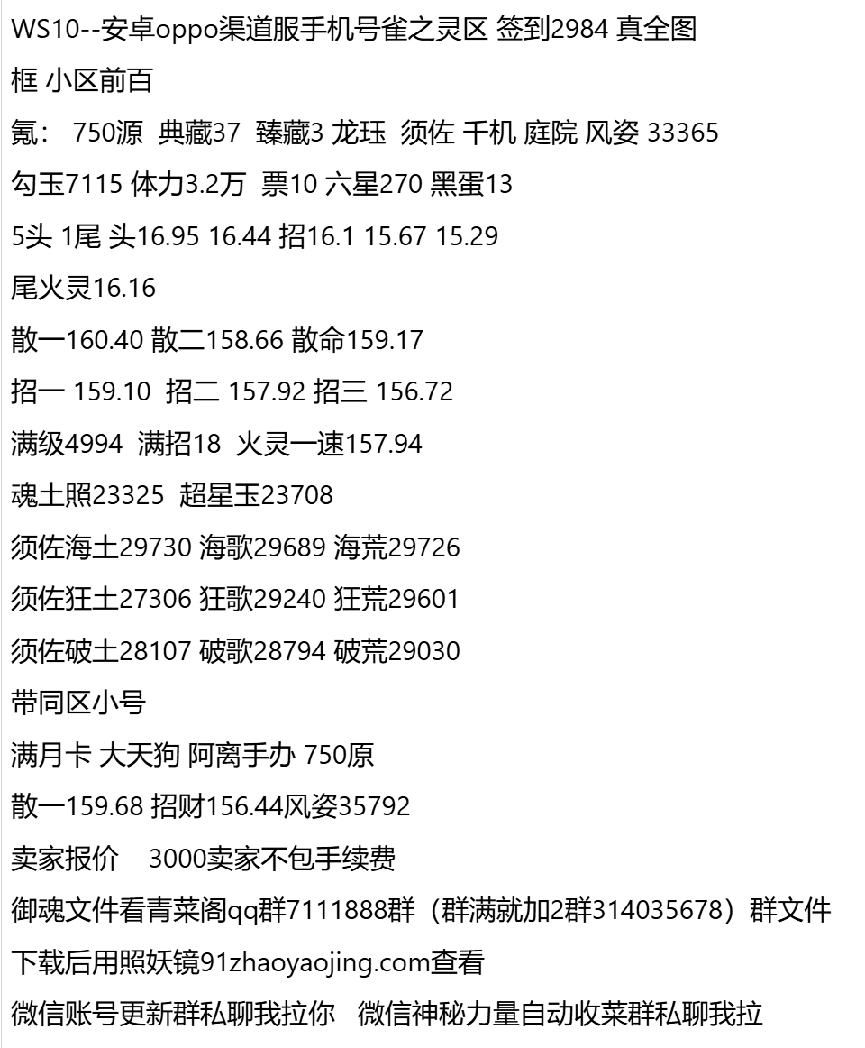WS10--安卓oppo渠道服手机号雀之灵区 签到2984 真全图
